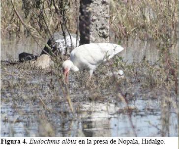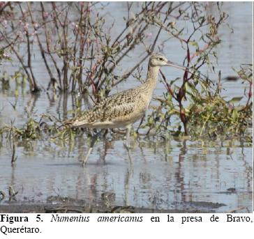 Observamos un adulto en la presa de Nopala, el 20 de octubre de 2010, alimentándose en una zona poco inundada y con restos de cultivos (Figura 4). Esta es una especie residente o migrante en costas mexicanas, con registros ocasionales en sitios alejados de las costas (Howell y Webb 1995). También se ha registrado esta especie en el noreste de Hidalgo (Valencia-Herverth et al. 2008) y en Metztitlán, también en Hidalgo (Ortiz-Pulido et al. 2010); así como en afluentes del manantial la Media Luna en San Luis Potosí (De Gortari-Ludlow y Chapa-Vargas 2012), embalses de municipios conurbados al norte de la ciudad de México (Ramírez-Bastida et al. 2011) y en Tlaxcala (Fernández 2000). Otros sitios alejados de las planicies costeras donde se ha observado están en Durango, Jalisco, Tamaulipas, San Luis Potosí, Puebla, Veracruz y Oaxaca (aVerAves 2012).