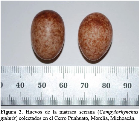 En el caso de los huevos, Márquez-Valdelamar (1998) señala que el tamaño de nidada varía de 3 a 5, mencionando por primera vez que los huevos son de forma oval y de color blanco con manchas y motas de color rosa pálido y café. Por otra parte, Soberanes- González et al. (2010) mencionan que el rango es de 3 a 6 huevos. En los dos nidos que colectamos en este estudio, el tamaño de la nidada varió de 2 a 3 huevos, aunque estos resultados no son concluyentes debido al pequeño tamaño de muestra; además, desconocemos si la nidada ya estaba completa o si hubo depredación. En lo referente a la coloración de los huevos, la descripción no concuerda totalmente con la de Márquez-Valdelamar (1998) ya que según nuestra apreciación, los huevos presentan un tono beige con manchas marrón a café (Figura 2) y no blanco con manchas rosadas como la autora lo describe. Esta diferencia en la coloración podría deberse a que posiblemente se presente variación geográfica en el color de los huevos entre poblaciones; sin embargo, esto requiere de ser confirmado. En cuanto a las medidas de los huevos, el tamaño promedio de cuatro huevos reportado por Márquez-Valdelamar (20.8 x 16.2 mm) es ligeramente menor al tamaño que nosotros reportamos (23.0 x 16.5 mm); sin embargo, estas diferencias pueden ser debidas a la variación natural de los huevos en la población.