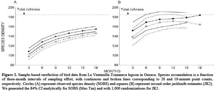 Despite shortcomings in species detection, sampling methods of standardized effort provide a basis for making robust comparisons of the number of species observed between sites. Rarefaction curves allow the comparison of observed or estimated species richness at comparable numbers of individuals and it is also possible to do this with sample-based rarefaction if the abscissa is re-scaled to individuals (Gotelli and Colwell 2001). Despite this, ornithological studies tend to use randomized species accumulation curves as a function of samples (Macedo et al. 2007, Ugalde-Lezama et al. 2010, Bojorges-Baños 2011), representing species density rather than richness (Gotelli and Colwell 2001), which has implications when interpreting the results (Moreno and Halffter 2000, Moreno and Halffter 2001, Willot 2001).