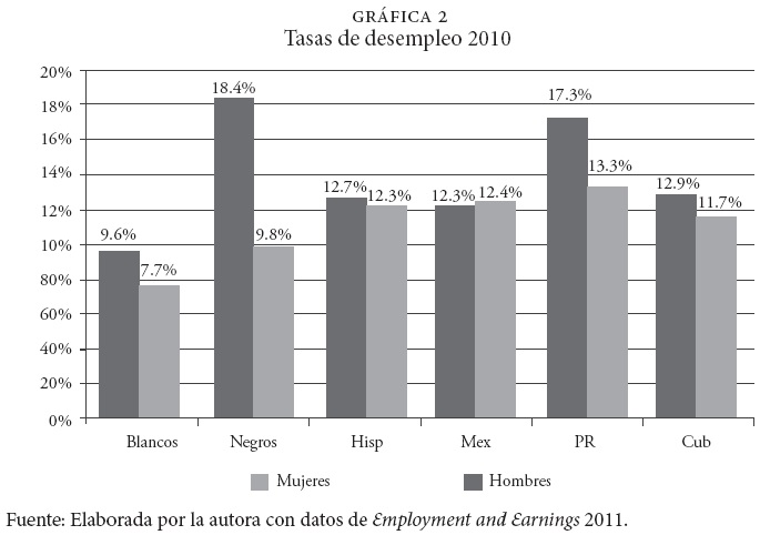 En general, la tasa de desempleo de los mexicanos es más baja que la de los puertorriqueños y más alta que la de los cubanos. Los cubanos suelen tener tasas de desempleo ligeramente inferiores a las de la población blanca total (que como se ha señalado incluye a la mayoría de los hispanos). Lo que llama la atención en 2010 (ver gráfica 2) es el alto desempleo entre los hombres cubanos, que inclusive supera la tasa de los varones mexicanos, y las tasas extremadamente altas para hombres negros y puertorriqueños.