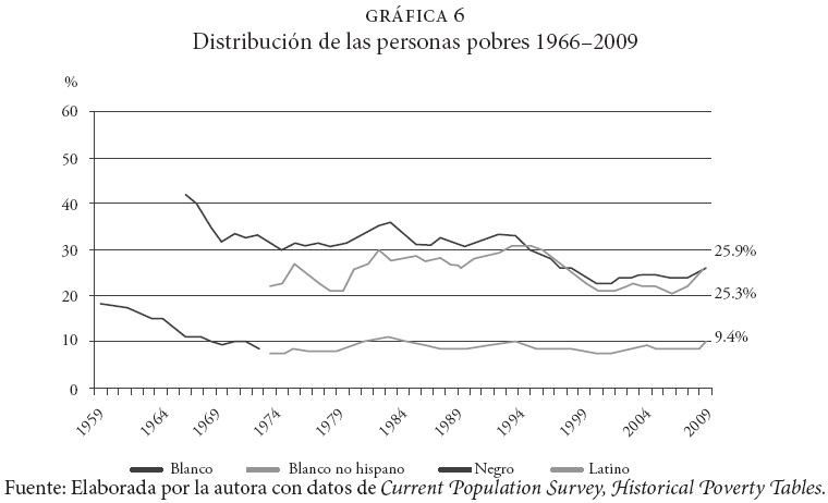 Es muy notable que, a nivel nacional, y no obstante los retrocesos sufridos en periodos de recesión, el índice de pobreza para los afroamericanos disminuyó a lo largo de los últimos 40 años del siglo XX (de 55.1% en 1959 a un mínimo de 22.5% en 2000); a partir de entonces, se ha repuntado ligeramente, alcanzando el 25.9% en 2009. El caso de los latinos ha mostrado un comportamiento distinto (ver gráfica 5). Entre 1972 y 1994, la incidencia de pobreza para ellos fue más bien ascendente (pasó de 22.8% en 1972 a 30.7% en 1994), aunque ha disminuido significativamente desde entonces. Alcanzó su nivel más bajo de 20.5% en 2006 y subió a 25.3% en 2009. Dicho indicador fue mayor para los latinos que para los afroamericanos durante cuatro años consecutivos (de 1994 a 1997). Dado el mayor crecimiento general de la población latina, mientras la participación de los afroamericanos en el conjunto de los pobres muestra por lo general una tendencia descendente de 31.1% del total en 1966 a 24.3% en 2009 (ver gráfica 6), la de los latinos creció marcadamente, de 10.3% en 1972 a 28.3% en 2009 (US Census Bureau, 2010b). En otras palabras, los latinos, que constituyen alrededor del 16% de la población estadounidense, son cerca del 30% de las personas que tienen ingresos por debajo del umbral de la pobreza. De continuarse las tendencias actuales, la población hispana en Estados Unidos será no solamente la minoría étnica o racial más numerosa como fue constatado en el censo de 2000, sino que pronto llegará a ser también la más depauperada. Además, la proporción de los migrantes recién llegados que vive cerca o debajo del umbral de la pobreza es considerablemente más alta.