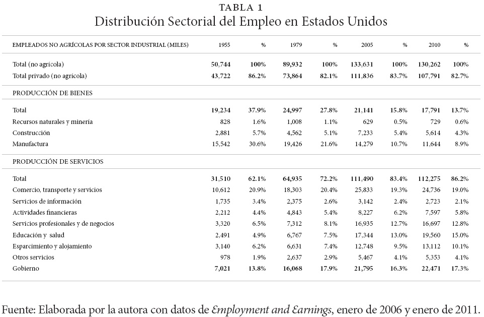 Aun cuando Robert Reich (1992:85-86) plantea que la distinción tradicional entre bienes y servicios carece de sentido en nuestros días, no deja de llamar la atención que un porcentaje creciente de la PEA se dedica a la producción o provisión de servicios (62.1% en 1955 frente a 86.2% en 2010) y una proporción decreciente (37.9% en 1955 comparado con 13.7% en 2010) se ocupa en la producción de bienes (ver tabla 1, USDOL, 2006 y 2011). De todas formas, y en parte gracias a un creciente déficit comercial, la gama de productos disponibles para los consumidores estadounidenses es mayor que nunca.