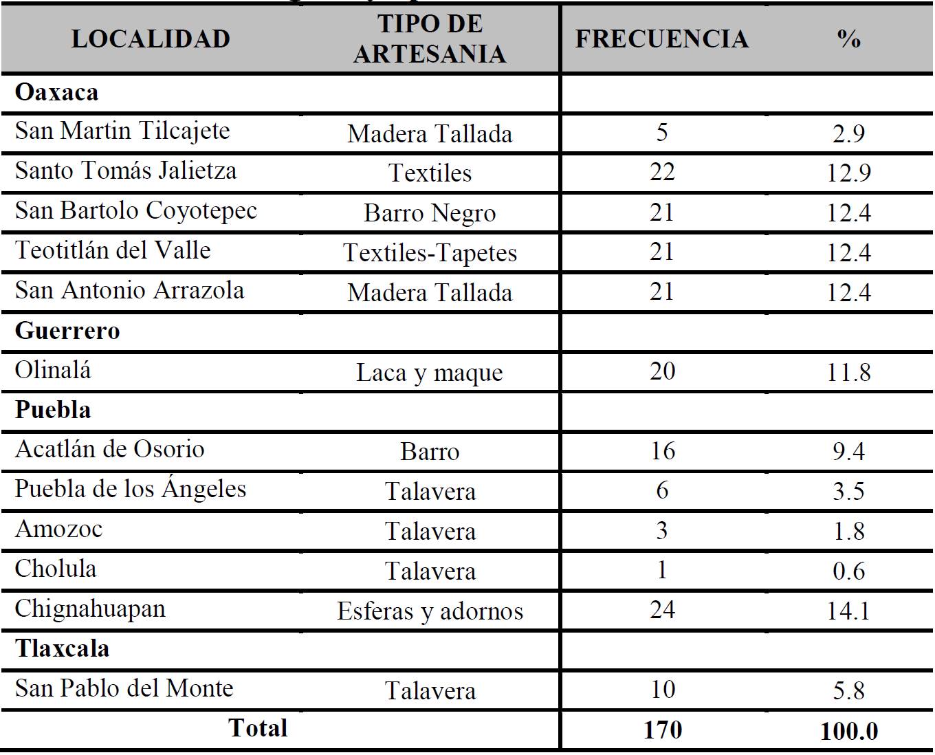 La muestra quedando integrada de la siguiente forma: 52.9 % en Oaxaca, 11.8% en Guerrero, 29.4% en Puebla y 5.9% en Tlaxcala. De las artesanías sobre salen el barro y alfarería 35.9%, los textiles 25.3%, la madera tallada 25.3%, la laca y maque 11.8% y las esferas y adornos 11.8%.