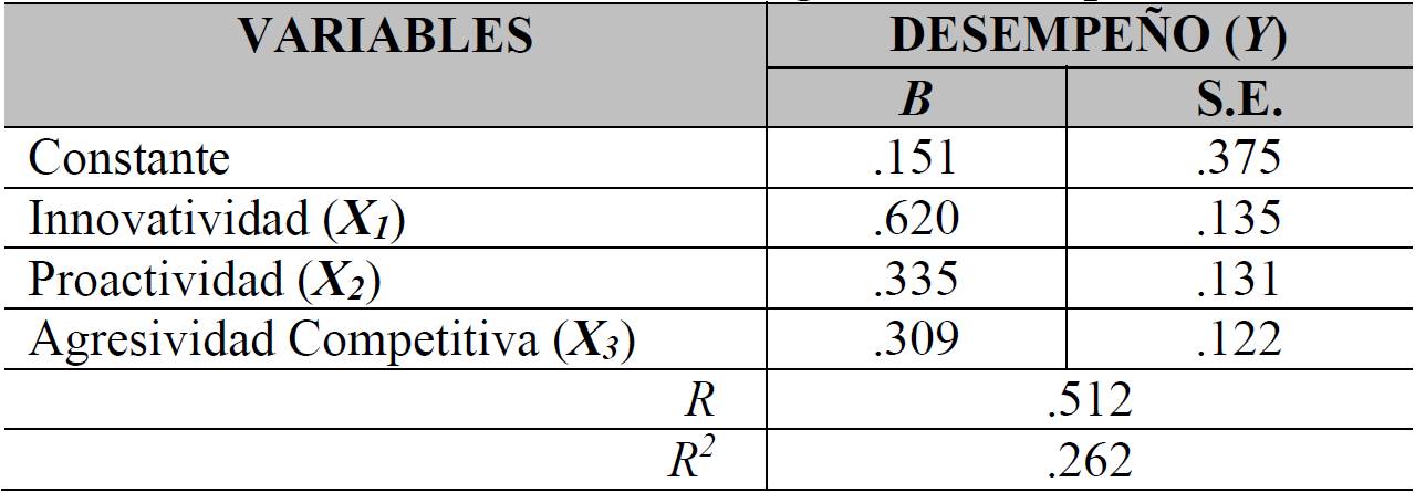 Para conocer sobre el efecto particular de cada una de las variables de la orientación emprendedora en el desempeño, se realizó un análisis de regresión lineal múltiple en donde solamente fue excluida la toma de riesgos ya que no presentó un coeficiente de asociación significativo con el desempeño. Según Babbie (2000, p.395), el análisis de regresión representa las relaciones entre variables en forma de ecuaciones, que se utilizan para predecir los valores de la variable dependiente (desempeño) sobre la base de los valores de una o más variables independientes (innovatividad, proactividad y agresividad competitiva).