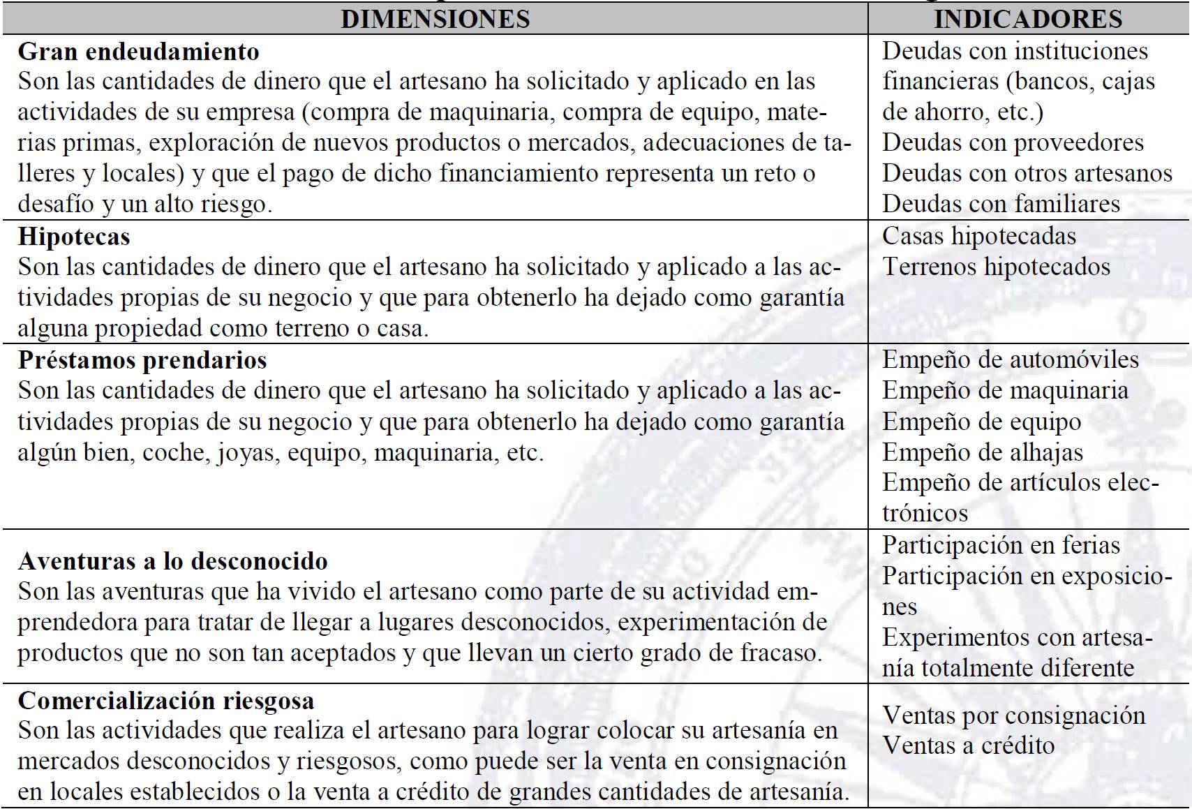 Hernández, Yescas y Domínguez (2007, p. 92) mencionan que la toma de riesgos en el sector artesanal mexicano se ve reflejada por la disposición que tienen los dueños de los negocios a recibir financiamientos o créditos lo que les permite mejorar en algo la situación financiera del negocio. En esta investigación, la toma de riesgos se define como las acciones que el artesano ha llevado a cabo para continuar o mejorar su actividad obteniendo préstamos difíciles de pagar, hipotecas, préstamos prendarios, emprendiendo aventuras a lo desconocido y comercialización riesgosa. La operacionalización se muestra en la tabla 4.