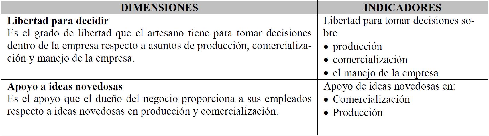 La autonomía en esta investigación se define tomando en consideración a Lumpkin, Cogliser y Schneider (2009), como las acciones independientes hechas por los dueños de los negocios de artesanía o alguno de sus miembros para crear una idea o una visión y llevarla a su cumplimiento. La operacionalización se muestra en la tabla 5.