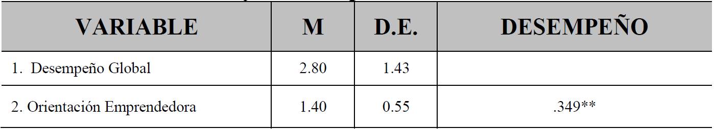 Tabla 8. Correlación Bivariada de Pearson entre la Orientación Emprendedora y el Desempeño Global