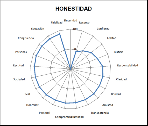 Si bien la honestidad no es un valor que dentro del ideario de la universidad estudiada este declarada expresamente, fue mencionada por los estudiantes en los primeros 5 lugares tanto de la jerarquía de los valores deseables como deseados. De hecho, en los valores deseables ocupa el primer lugar y en los valores deseados ocupa el segundo lugar. Dentro de los valores deseables es más importante en los primeros y en los últimos semestres, en los semestres intermedios parece que pierde importancia. En la Fig. 6 se muestran las palabras relacionadas que dieron significado a este valor. La primera palabra es sinceridad, seguida de respeto, que ha sido el valor más importante, además confianza, lealtad y justicia. Es decir, en este valor se mezclan relaciones tanto del polo de promoción personal con el de trascendencia.