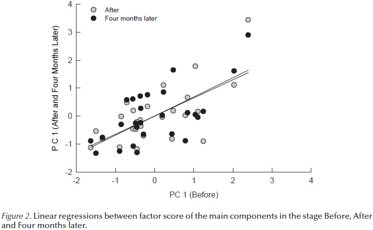 In the principal components analysis was obtained that the second components did not have any contribution, since there were no linear association scores. So the factor score of the first components were analyzed with linear regressions and obtained scores association of individuals between the phase before vs. after (y = 7.6 e-6 0.68 * x, F = 22, P <0.0001, r2 = 0.45) and between before vs. four months later (y = 1.4 e-5 0.65 * x, F = 22, P <0.0001, r2 = 0.40) (Fig. 2). This shows that the intervention on study subjects remains immediately After PEI and Four months later.