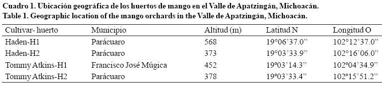 Características de la región y los huertos. El Valle de Apatzingán, Michoacán, tiene un clima semiárido cálido (García-Amaro, 1998), con lluvia promedio anual de 785 mm, distribuida de julio a octubre. Se seleccionaron cuatro huertos comerciales de mango, dos de 'Haden' y dos de 'Tommy Atkins', todos con tipo de suelo Vertisol pélico (alto contenido de arcilla expansiva conocida como montmorillonita que forma profundas grietas en años o estaciones secas. Base Referencial Mundial del Recurso Suelo, 2007) (Cuadro 1). Al inicio de esta investigación, los huertos de 'Haden' tenían 16 años de edad y estaban establecidos a 12 x 12 m (huerto 1) y a 11 x 11 m (huerto 2). Los dos huertos de 'Tommy Atkins' eran de 18 años con un marco de plantación de 11 x 11 m. En cada huerto se seleccionaron cinco árboles con tamaño semejante. Para cada uno de estos árboles, se registró la producción en 2009.