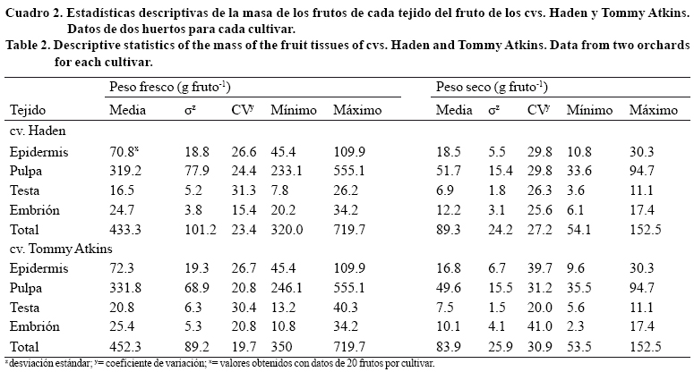 En el cv. Haden el peso fresco promedio del fruto fue 433.3 g y en el cv. Tommy Atkins 452.3 g. El peso seco promedio tuvo un comportamiento inverso al peso fresco, ya que fueron los frutos de 'Haden' los que tuvieron un valor mayor (89.3 g) a los de 'Tommy Atkins' (83.9 g). En ambos cultivares el tejido con mayor peso fresco y seco fue la pulpa.