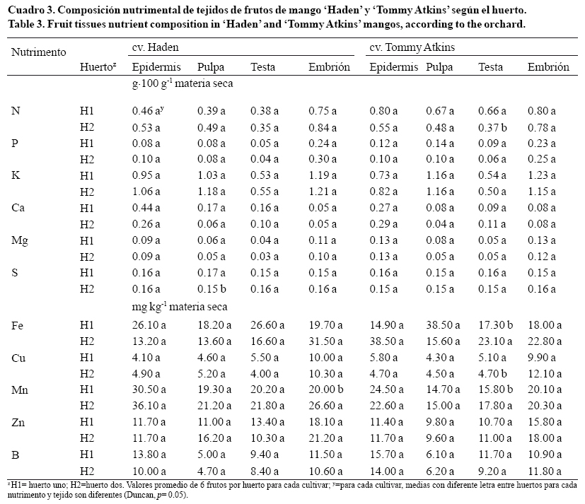 El huerto de donde se obtuvieron los frutos tuvo un efecto limitado sobre la composición nutrimental de los tejidos del fruto de mango. En 'Haden', sólo se detectaron diferencias entre huertos para los contenidos de S en la pulpa y de Mn en el embrión (Cuadro 3). En 'Tommy Atkins' ocurrió algo similar, la testa fue el único tejido que mostró diferencias en el contenido de N, Fe, Cu y Mn debidas al sitio (huerto).