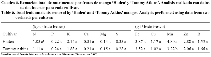 La cantidad de nutrimentos removidos por tonelada de fruto fresco fue similar entre los dos cultivares de mango estudiados. La excepción fue el Mn ya que 'Haden' removió 4.80 g t-1, comparado con 3.22 g t-1 en 'TommyAtkins' (Cuadro 6). Para 'Haden' la magnitud de la cantidad de nutrimentos removidos tuvo el siguiente orden: K > N > S > Ca > P > Mg > Mn > Fe > Zn > B > Cu. En el caso de 'Tommy Atkins' fue: K > N > S> P > Ca > Mg > Fe > Mn > Zn > B > Cu.
