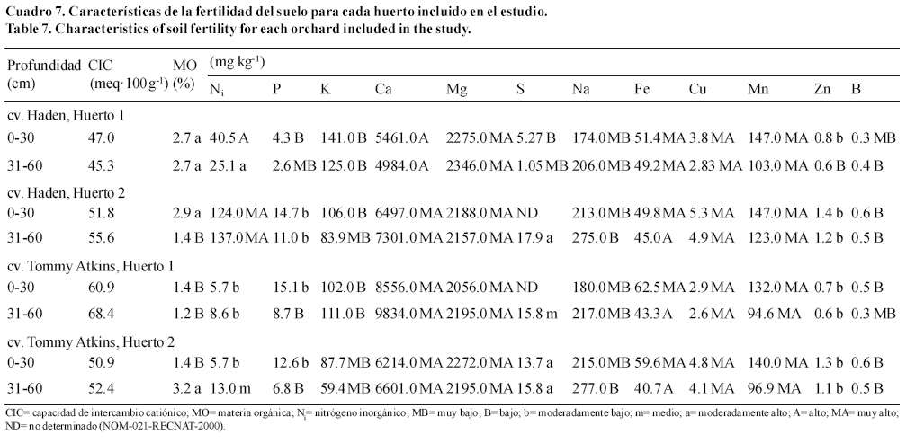 Los suelos de los huertos con los cvs. Haden y Tommy Atkins empleados en el presente estudio mostraron algunas diferencias en su fertilidad que fueron definidos con base a la Norma Oficial Mexicana sobre fertilidad y clasificación de suelos (PROY-NOM-021-RECNAT-2000) (Cuadro 7). Los huertos del cv. Haden presentaron diferencias en el contenido de N, P, K, Ca, Na, Fe, Zn y B. Para los huertos del cv. Tommy Atkins hubo diferente contenido de N, P, K, Na y B.