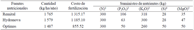 Considering one hectare (1 ha) as reference, a period of 4 years production (productive period after the first harvest), and assuming constant price for nutritional sources in this period, the annual savings were estimated in $ 329.58 USD as the cost difference between Hydranova fertilization and the optimal amounts obtained (Table 3).