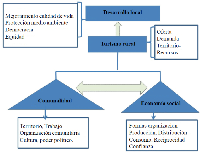 The theoretical model incorporates the categories of analysis for addressing rural tourism, raised from the relationship between the theory of commonality, social economy, tourism and local development, which attempts to show that in order to move towards the local development in rural commonalities, it is necessary to consider strategies that promote endogenous growth of territorial units through, mechanisms that promote development processes and structural changes in the organizational processes of production, distribution and consumption as well.