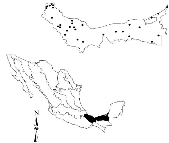 Study area. The region South Gulf Coastal Plains is one of the fifteen physiographic provinces in Mexico. It is located in the south-eastern part of Mexico (Figure 1), bounded to the west by the Transverse Volcanic Belt, to the south by the Sierra Madre del Sur and to the east the Yucatan Peninsula. Its average width varies between 125 and 150 km. Includes the coastal regions of southern Veracruz, covers virtually the entire State of Tabasco, some areas of northern Oaxaca and Chiapas, Campeche and southwest. Consisting of the sub-villages: Coastal Plain of Veracruz; Sierra de los Tuxtlas; Plains and Marshes of Tabasco (Medina et al., 2010). The elevation in this region ranges from 0 meters above sea level on the border with the sea, 550 meters above sea level on the border with the Mountains; with sub-humid and humid climates, with annual average temperatures between 24 to 27 °C and annual rainfall between 1 500 and 2 250 mm (Medina et al., 2010).