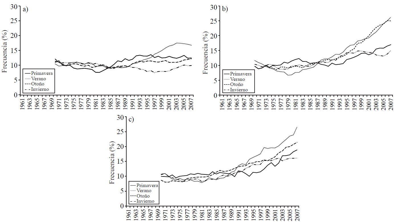 During spring, the frequency of cold nights has remained almost unchanged over the period 1961-2007, but not for the frequency ofwarm nights and hot days, showing an increase of 6% and 9%, respectively, which is equivalent to 5 and 8 days with minimum and maximum temperatures above 90 percentile. During summer, the highest frequency of cold nights, warm nights and hot days are manifested, increasing from 10 to 16% for cold nights, 11 to 26% for warm nights and 10-26% for hot days, which is equivalent to having 14 cold nights, 23 warm nights and 23 hot days during the summer, in the last decade analysed.