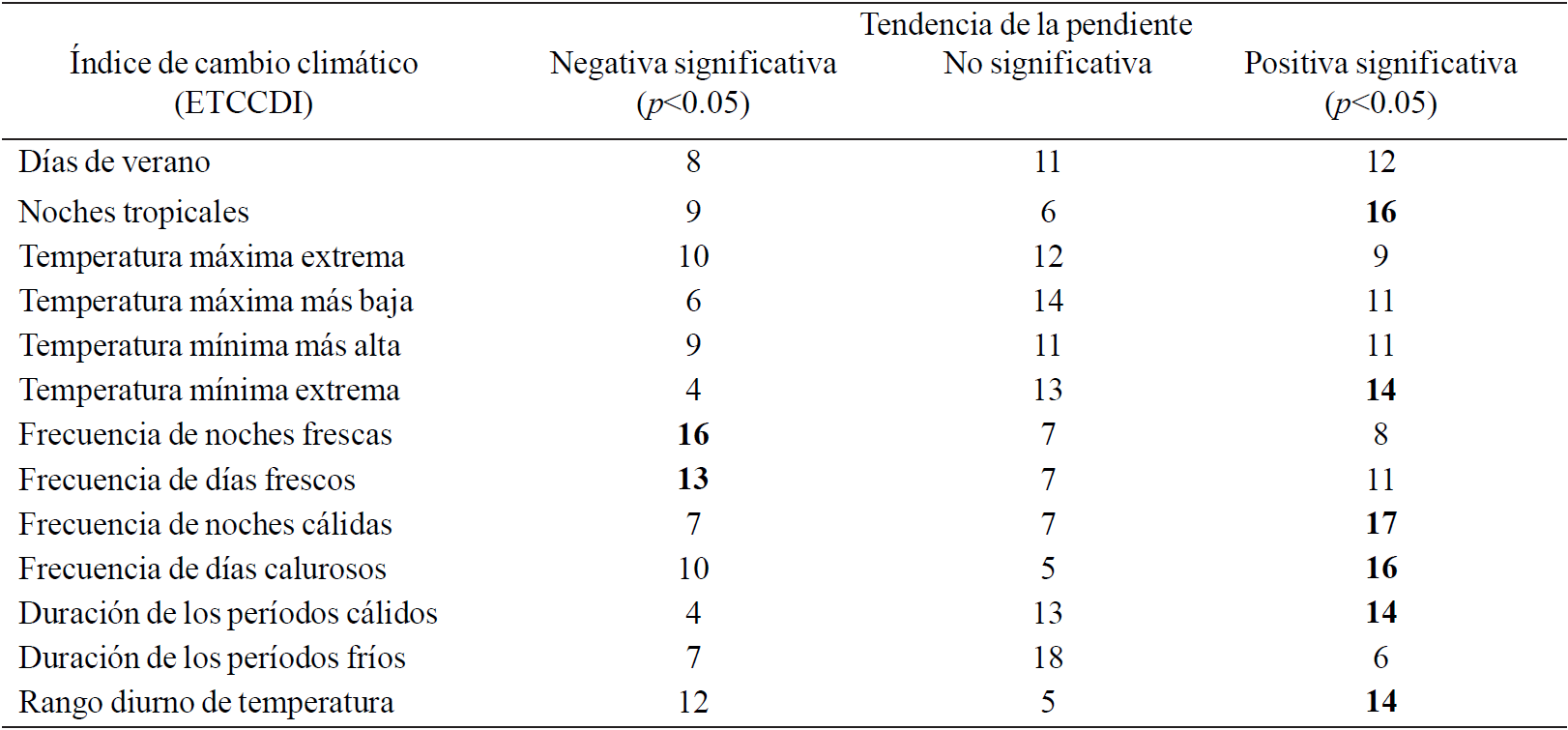 Indices of thermal extremes. The Table 2 shows the extremes found for each of the studied climate indices summarized.