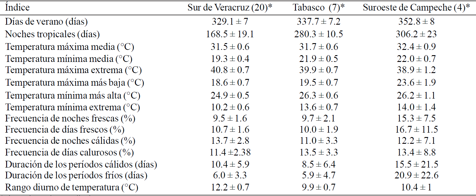 One of these regions is the Physiographic Province South Gulf Coastal Plains, which includes the States of Veracruz, Tabasco, Oaxaca, Campeche and Chiapas. The need to determine the behaviour of extreme weather related to temperature at the regional level will allow for valuable information for the development of adaptation measurements in the productive sectors. The aim of this study was to evaluate the tendencies ofthe climatic indices of weather extremes, based on maximum and minimum daily temperatures for the region South Gulf Coastal Plains.