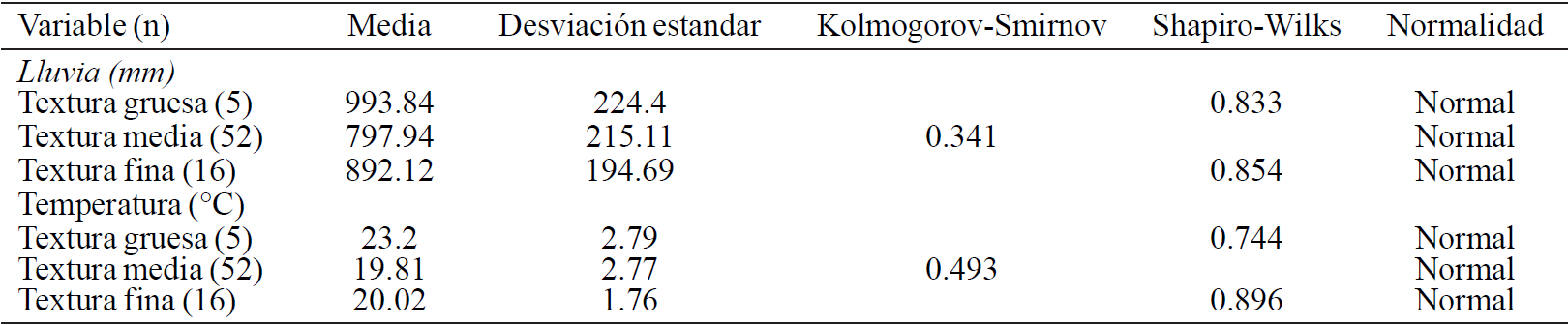 The results of the statistical analysis of temperature and annual precipitation from weather stations that correspond to the three textural groups are shown in Table 1. As can be seen, all climate data sets resulted in a normal distribution, even when it was analysed statistical different according to the number ofobservations ofthe three textural groups. The ANOVA reported no significant difference between groups for textural precipitation and temperature (Table 2).