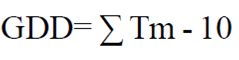 Development degree days (GDD) is an index ofheat buildup, commonly used to define the suitability of a region for growing grapes (Diffenbaugh et al., 2011; Hall and Jones, 2014). It is based on the observation that the vines begin their active growth in the spring when the average air temperature for five consecutive days reaches 10 °C (Amerine and Winkler, 1944).