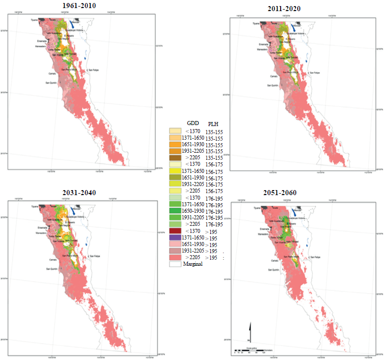 In the 2011-2020 scenario, these regions retain the characteristics mentioned above, except for the eastern portion of San Vicente would happen to the wine region V, this is already not be suitable for yielding table wine quality. In the next stage (2031-2040), the Valley of Guadalupe, Santo Tomas and San Vicente Premium, would be classified in the V PLH wine region with more than 195, the above as a result of the increase in temperature. The Ojos Negros valley would retain the classification IV, except for the north would take the classification V.