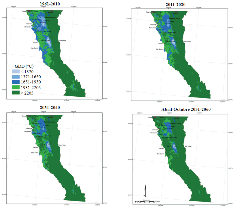 GDD. In the Figure 1 are shown the cumulative GDD of the first day of April to October 30, calculated based on the method Amerine and Winkler (1944) . It is noted that in the present situation (period 1961-2010) in the State we can find the five wine regions described by these authors. As expected, the regions where less GDD accumulate are located in the highest parts ofthe State, as in the case ofthe Sierra de San Pedro Martir located west of San Felipe and Juárez east of Ojos Negros, where temperatures are lower. In such places the altitude above mean sea level exceeds 1 000 m. In contrast desert regions located at a much lower altitude and east ofthe State, have a large cumulative GDD (> 2 205 °C).