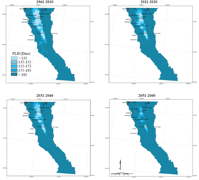 PLH. The PLH map (Figure 2) shows the classification of the five regions of B .C., as the regions with higher altitudes above sea level, located in or near the mountains of San Pedro Martir and Juárez indicated by the white expected colour, have less than 135 days PLH, which limits its feasibility for growing grapes. By contrast the regions where the wine valleys are located, such as Guadalupe, Santo Tomas and San Vicente have PLH greater than 195 days, allowing the cultivation of the vine with minimal risk of frost damage.