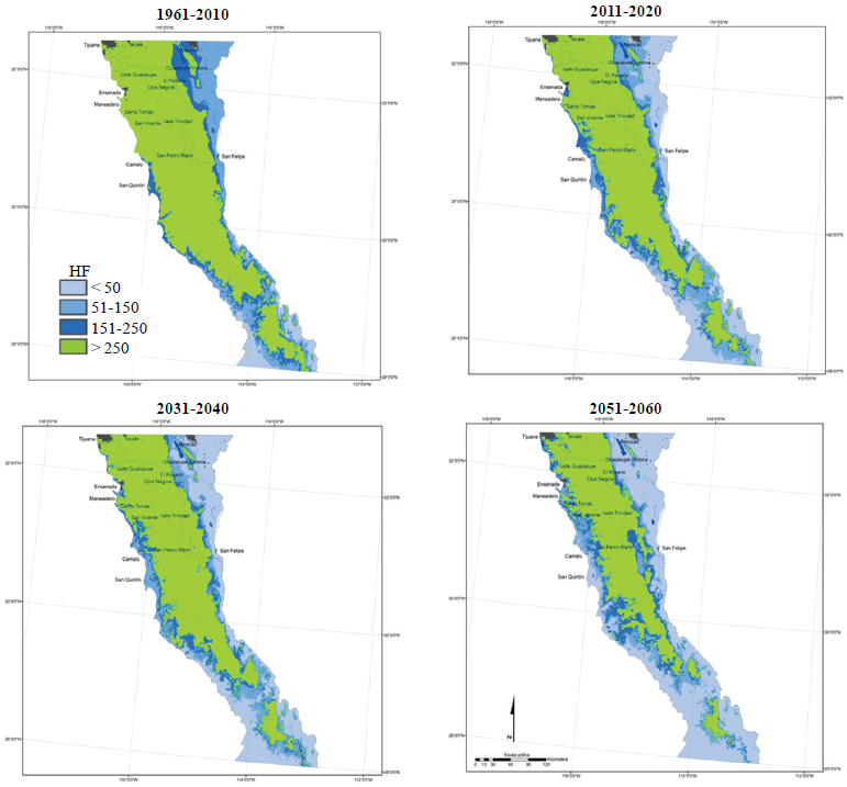 On the other hand, the analysis of the maps can identify areas under the effects of climate change could become the new producing quality wine regions in the State of B. C. The images show that in the long term (2051-2060), the regions around the mountains of Juárez and San Pedro Martir, as well as parts ofthe valleys of Ojos Negros and Trinidad have suitable conditions for growing grapes whose purpose is the development oftable wines. This condition would be for the coastal strip running from the south of the city of Ensenada to San Vicente.