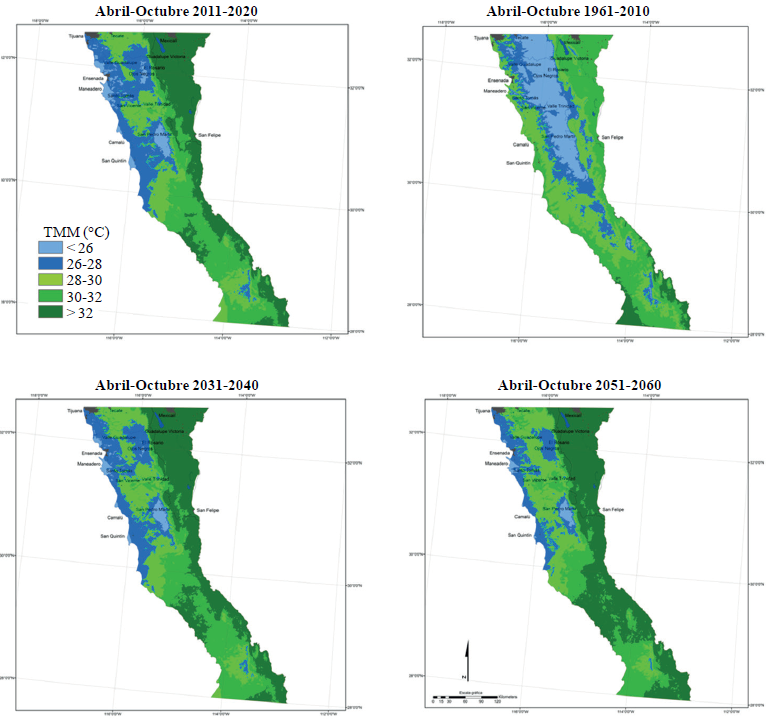 TMM. In the 1961-2010 scenario, the TMM is observed in the period from April to October, regions with higher than 32 °C values, and identified in Figure 4 with intense green colour are located on the fringe of the desert-coastal east of the State, and include in the north to Mexicali Valley and Southern limit State. Due to its high temperatures, all that portion is discarded in this paper as an area with potential for growing grapes for wine. As shown in the following three scenarios, areas with TMM above 32 °C, increase with the passage of time, implying a significant reduction in areas with potential for growing grapes for wine in B. C. According to the 2051-2060 scenario the area between the west coast of the State and saws higher than 1 000 m (indicated by the light blue) heights, would retain the potential for the wine industry.