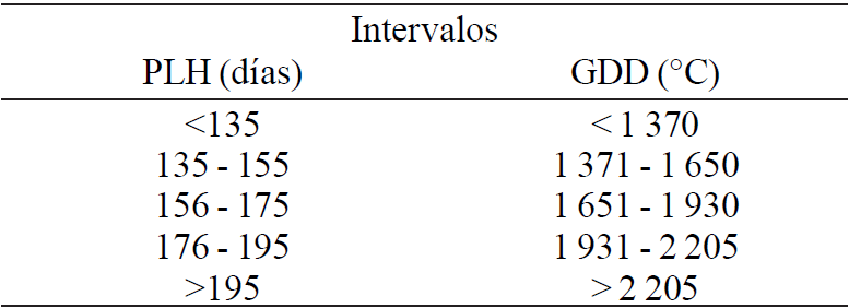 Based on the information just presented in the above table, the areas with less than 1 307 GDD and those with more than 2 205. This is excluded because the first value indicates the heat that builds up in the April-October period is insufficient to achieve fruit with enough sugar but with high acidity; while the second shows that the region accumulates so hot that the fruits can have high sugar content but low acidity, making them unfavourable for the production of table wines with good quality. The PLH parameter regions with less than 135 frost-free days, because this is a very short period to allow the growth of any vine cultivar were excluded; in other words the risk of frost damage to plants in these regions is quite high.