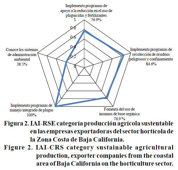 El desempeño de las empresas consideradas en la implementación de medidas en la categoría asociada a la producción agrícola sustentable, repunta que 100% de las empresas existen programas de manejo integral de plagas y los porcentajes de cumplimiento son altos en cuanto a la existencia de programas de recolección de residuos peligros y su confinamiento y la promoción de acciones para fomentar el uso de plaguicidas y fertilizantes de origen orgánico. La mayor oportunidad para las empresas se presenta en el rubro de adopción de programas integrales de administración ambiental, donde el porcentaje promedio de implementación de medidas es 38.5%.