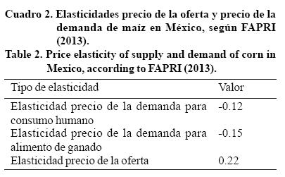 Las proyecciones en las importaciones de México se calcularon mediante los cambios en oferta y demanda de maíz en México. Para la obtención de los nuevos coeficientes de oferta y demanda de México se utilizaron las elasticidades de las mismas, obtenidas por FAPRI (Cuadro 2). Los cambios en el precio de los diferentes escenarios se aplicaron sobre la proyección base del mismo Instituto.