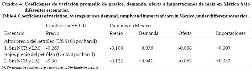 La reducción en el precio que se provocaría con la eliminación de las políticas de producción de biocombustibles en EE. UU, afecta el mercado de maíz en México y provocaría cambios en la oferta y demanda de este grano. Cuando el precio de petróleo es bajo, el precio del maíz se reduce en un mayor porcentaje dando como resultado que la oferta de maíz se reduzca 6.7% respeto a la proyección base 2012 estimada por FAPRI, mientras que cuando el precio del crudo es alto la oferta responde con una reducción promedio de 5.8% (Cuadro 4).