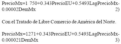 Donde: precioMx= precio de maíz en México; precio EE. UU=precio de maíz en EE.UU; LagPrecioMx= Precio de maíz en México del año anterior; DemMx= demanda de maíz en México; TLCAN= Tratado de Libre Comercio de América del Norte (cuyo valor es 0 antes del TLCAN y 1 con el TLCAN).