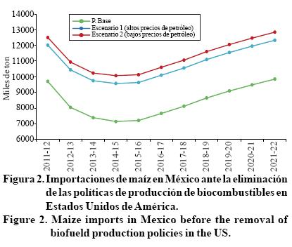Con el TLCAN el precio del maíz baja y con ello aumentan las importaciones. Las exportaciones de EE. UU, hacia México se ven fortalecidas si las políticas de producción de biocombustibles fueran eliminadas en el país vecino. Es por ello que gráficamente la proyección base está por debajo de los dos escenarios (Figura 2). Los bajos precios del maíz en el mercado estadounidense reducen la oferta del grano básico por parte de los productores mexicanos. En ausencia de una política de estímulos a la producción de granos básicos, a la poste, lleva a una destrucción de los sistemas productivos locales, un fortaleciendo de la dependencia del exterior y un debilitamiento de la seguridad alimentaria.