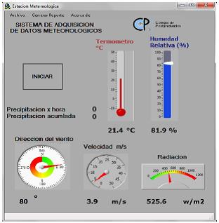 The developed acquisition system of meteorological data senses and records correctly, the readings of the weather elements: temperature, humidity, radiation, precipitation, wind speed and direction, which is an alternative to a weather station. The modular structure of the system hardware helps for an easy replacement of components in case of damage; also, the processing capacity cannot only perform functions of acquisition, but has the ability to perform other functions such as irrigation control calculating evapotranspiration, etc.