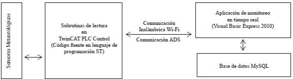 El objetivo de este trabajo fue desarrollar un sistema de adquisición de datos meteorológicos en tiempo real utilizando un controlador lógico programable (PLC) como una alternativa dentro de las estaciones meteorológicas comerciales. Para sensar la: temperatura del aire, humedad relativa, radiación solar, precipitación, velocidad y dirección del viento, se usaron sensores comerciales, durante 2013, para probar la estación, en la estación meteorológica del Colegio de Postgraduados, Campus Montecillo. El sistema se compone de un PLC (modelo CX1020, marca Beckhoff), una Laptop donde se instaló una aplicación de monitoreo en tiempo real que se desarrolló en Visual Basic 2010 Express y la base de datos en MySQL para almacenar la información, que se puede usar para fines diversos. La interacción entre el PLC y la aplicación de monitoreo se realizó mediante comunicación inalámbrica Wi-Fi. Se usaron los programas TwinCAT System Manager (para la configuración del hardware) y TwinCAT PLC Control (para la programación del PLC). Se evaluó el funcionamiento del sistema al realizar comparaciones de las lecturas obtenidas de los sensores, contra instrumentos de referencia y sensores de una estación meteorológica Campbell Scientific. Los resultados indican que es factible el uso del PLC en la implementación de estaciones meteorológicas.