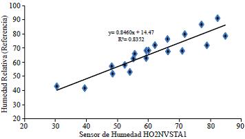 Relative humidity: comparing the readings of the sensor HO2NVSTA1 against moisture calculated from the temperature on dry and wet bulbs thermometers of the ventilated Assman psychrometer with its correction voltage steam by the atmospheric pressure (Herrera et al., 2012). The adjusting model is shown in Figure 7. Obtaining a determination coefficient R2= 0.8352, indicating that there is an acceptable ratio between both measurements.