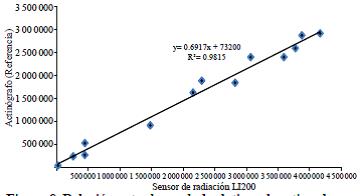 Radiation: the radiation sensor readings were compared against the bimetallic actinograph, Robitzsch type (Figure 8). From the actinograph's graph, the area under the curve for one-hour periods through an integrated leaf area was determined, then conversion was performed on cal/cm2 from the conversion factor (1 cm2= 19.22 cal/ cm2), for finally turning W/m2 (1 cal/cm2= 41868 W/ m2). Although both instruments work in different spectral range, the first in the global radiation and the second in the photosynthetically active radiation (PAR), both responses are related (determination coefficient R2= 0.9815).