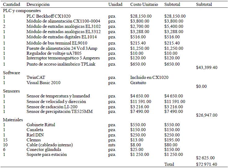 An economic comparison was performed between the railway stations developed into a commercial Campbell Scientific, taking into account only the components for measuring the same variables and real-time monitoring. The Table 7 shows the cost of the station developed with PLC (cost in Mexican pesos), and Campbell Scientific equivalent cost was $13 US $928. If we consider a price equal dollar to 13 pesos (OctobeR2013), it has an equivalent cost of $181 064.00 pesos for Campbell Scientific station and $72 971.40 for the developed PLC, which has a difference more than $ 100 000.00 pesos, and thus we conclude that the present work represents an economical alternative to commercial automatic stations.