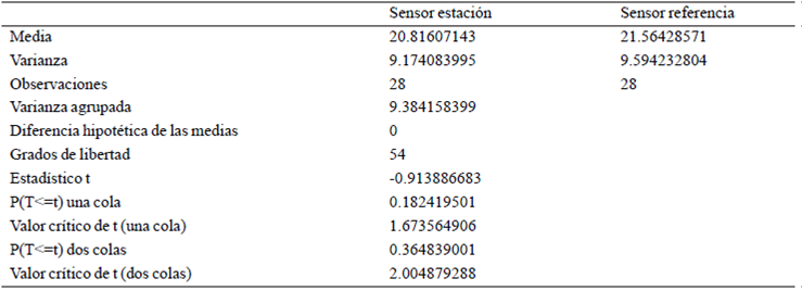 Also making a t-test (Table 2), establishing the hypothesis H0: μ1= μ 2 and Ha: μ1≠ μ2 (where μ1 and μ2 are the sample means). H0 assumes no statistically significant between the mean temperature difference samples. It was found that |tcalculada|= 0.9138 <ttables= 2.0048 and that the value-p= 0.3648 > 0.05, therefore the null hypothesis is accepted and affirmed that there is no statistically significant difference between the mean of the samples for a level of significance α= 0.05.