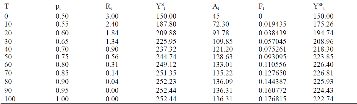The Table 1 shows yields at 100 cycles of selection in each tenth cycle, are also shown: the gene frequency (pt), the response to selection (Rt) calculated with Equation [5], additivity (At) calculated with Equation [1], and St calculated with Equation [3], F t calculated with Equation [6] and