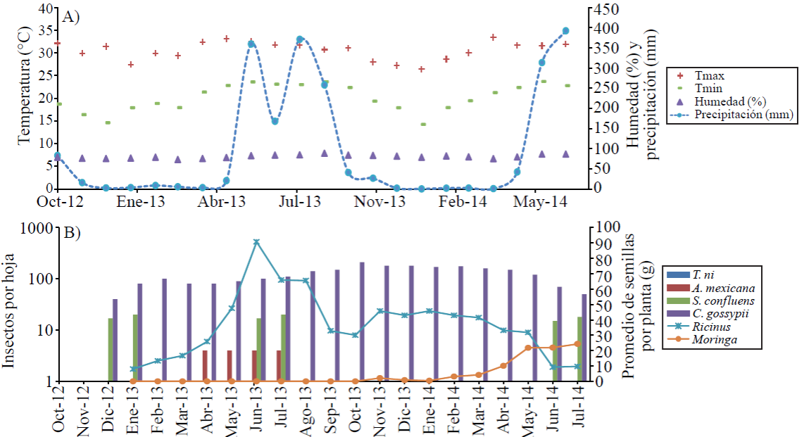 An experimental plot with R. communis and M. oleifera was established in the Colegio de Postgraduados research center, located in the central region of the state of Veracruz. Initial results published by Valdés et al. (2014) briefly identified important insect pests that affected both species. The aim of this study is to document: 1) the behavior of the main insect pests affecting cultivars of M. oleifera and R. communis in relation with the climatic conditions and; 2) the effect of these insects on the survival and productivity of these plants.