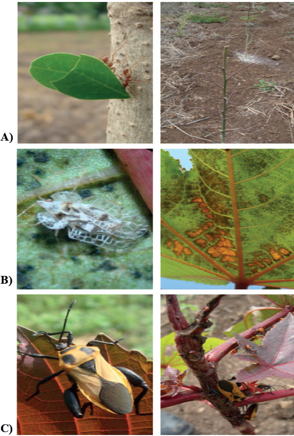 Figure 2 Major insect pests observed in intercropped Moringa and Ricinus and associated damage A) Atta Mexicana; B) Corythucha gossypii; and C) Sagotylus confluens