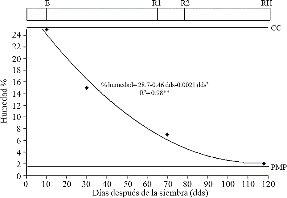 En la Figura 2, se observa que la humedad residual disminuyó conforme avanzó el desarrollo del cultivo. Dicha tendencia se ajustó a un modelo de regresión cuadrático. Al inicio del experimento se registró 25% de humedad (capacidad de campo) y a los 118 días (final del ciclo) de 2% (cerca del punto de marchitamiento permanente). De acuerdo con el modelo de regresión, la reducción de humedad por día fue en promedio de 0.46%. Durante el desarrollo del cultivo visualmente no se observó marchitez de las plantas, lo cual hace suponer que es un cultivo tolerante a condiciones de humedad limitada. Lo cual puede atribuirse a que las hojas del garbanzo secretan una solución acuosa compuesta de ácido málico y oxálico que captan humedad ambiental durante la noche, lo que podría ayudar a complementar el requerimiento hídrico para su crecimiento (Martínez y Calderón, 2005).