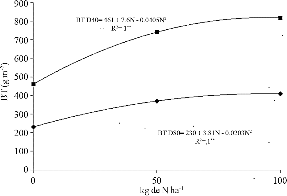 En cuanto a la interacción D*N, en la Figura 4 se observa que la respuesta en BT a la interacción se ajustó a un polinomio de segundo grado. Así, en D40, la respuesta en BT al N fue más alta, puesto que por cada kg de N ha-1 que se aplicó la BT aumentó en 7.6 g m-2, mientras que con D80 aumentó en 3.8 g m-2. Asimismo, la mayor BT se generó con D40-N100, con incrementos de 56% respecto a N0-D80 (Figura 3). Dicha respuesta está determinada por un mayor crecimiento del dosel vegetal estimulado por el N, por su efecto sobre la expansión foliar (Escalante, 1995; Escalante 2001) y a la mayor cobertura del suelo provocada por la siembra a distancias cortas, que conduce a una mayor intercepción de radiación y un uso más eficiente del agua. Resultados similares se reportan en girasol (Aguilar et al., 2005).