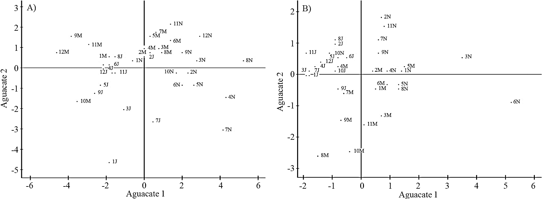 The intensity of the smell of the fruits of Jalisco and Michoacan were grouped into the middle class, while those in Nayarit were located in the lower and middle classes. In the case of fat perception and firmness of flesh, most of the fruits of the three regions was at the middle level (greasy and strong, respectively). Regarding taste, more than 90% of the fruit tasted each producing region were rated with an average intensity (Table 4). There was no statistical difference between fruit in the three producing regions for any of the organoleptic characteristics evaluated (data not shown).