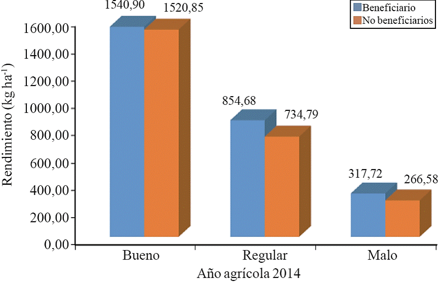According to the cost of corn production in 2014 ($5 382.01 ha-1), with yields of 855 kg ha-1 and the price of corn of $ 3.4 kg-1, the value of production per hectare was of $ 2 907 ha-1. So, the loss producers who planted corn was $ 2 475 ha-1. Figure 3 shows a comparison of unit corn yields obtained producers beneficiaries considering a good time, regulate one (which was the case in 2014) and one bad. Of the 28 producers are not beneficiaries of the program met only 53.5% had a surplus in grain production in 2014.